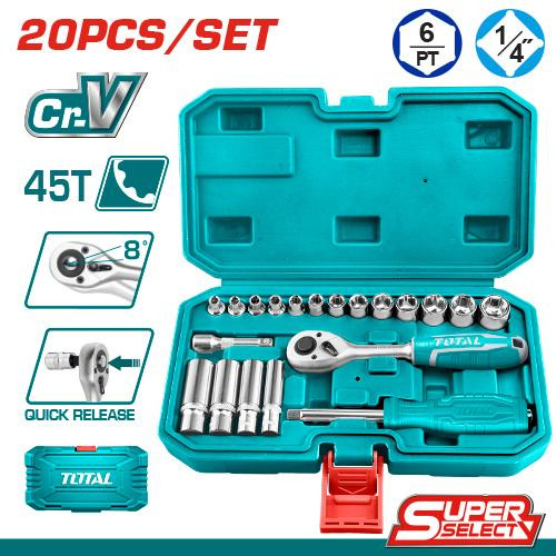 مجموعه سوکت 20 عددی 1/4 اینچی 1 عدد 1/4 اینچ DR. دسته جغجغه، 45T 13 عدد 1/4 اینچی DR. سوکت: 4،4.5،5،5.5،6،7،8،9،10،11،12،13،14 میلی متر 1 عدد 1/4 اینچ DR. نوار پسوند، 2 اینچ (50 میلی متر) 1 عدد 1/4 اینچ DR. دسته پیچ گوشتی 4 عدد 1/4 اینچی DR. سوکت های شش ضلعی عمیق: 8، 10، 12، 13 میلی متر مواد: CR-V (50BV30)، عملیات حرارتی بسته بندی شده توسط BMC
