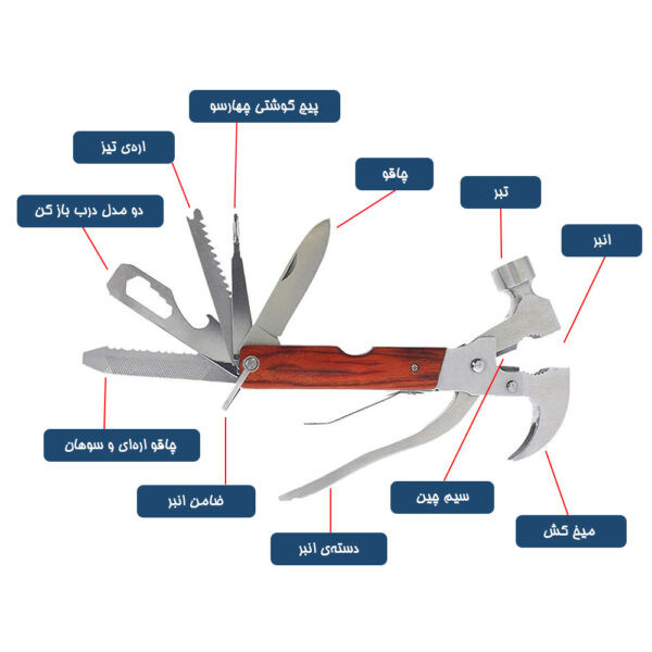 ابزارها شامل: ✰ چکش ✰ انبردست ✰ چاقو ✰ اره ✰ درب باز کن ✰ سوهان ✰ پیچ گوشتی چهارسو و دوسو ✰ میخ کش
