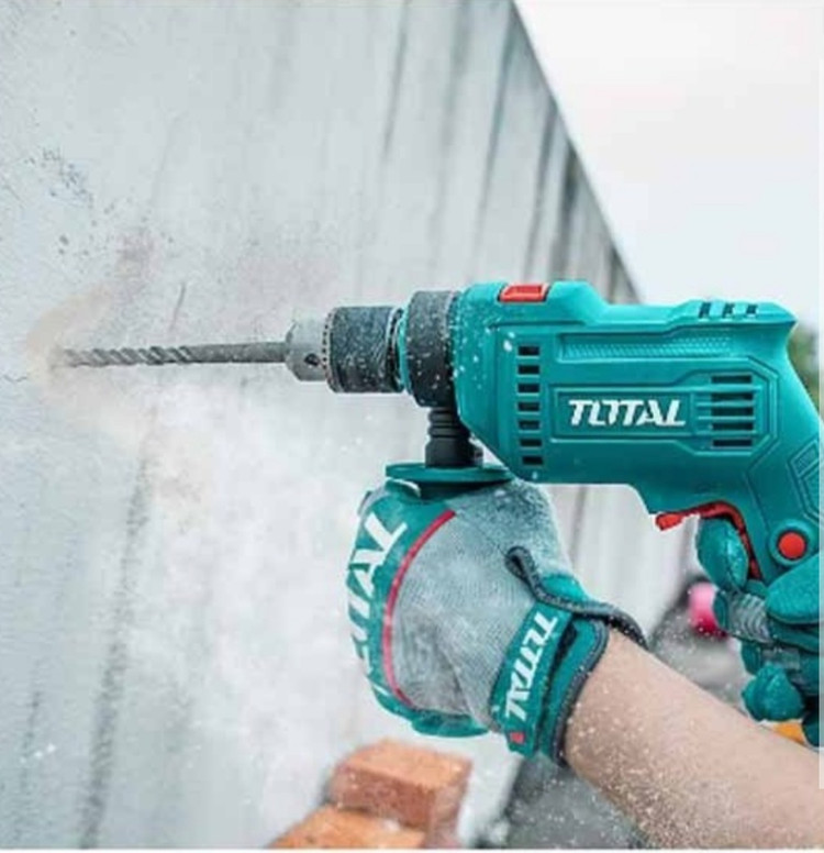 این دریل چکشی توتال برند فرانسه که در کشور چین تولید می شود. قابلیت چکشی دریل یکی از ویژگی های مهم این نوع دریل هاست. در حالت چکشی، دستگاه دریل میتواند ضرباتی منظم را بر سطح وارد آورد. این ویژگی در سوراخ کردن سطوحی ساخته شده از مصالح ساختمانی مانند گچ و سیمان بسیار کارگشا بوده و فرایند سوراخکاری را سرعت میبخشد. سرعت چرخش و قابلیت کنترل آن یکی از ویژگیهایی مهم در انتخاب دریل است. شرکت توتال این محصول را به شکلی طراحی کرده که کاربر میتواند سرعت چرخش آن را کنترل کند. برای این منظور یکی شستی دیمردار روی دستگاه قرار گرفته است. حداکثر سرعت چرخش این دستگاه مقداری برابر 3000 دور بر دقیقه است. با وجود این قابلیت کاربر میتواند با سرعت کم چرخش دستگاه، نشانهگذاری مته را انجام دهد. همچنین وجود قفل سوییچ در این دستگاه موجب شده تا کاربر بتواند بدون نیاز به نگه داشتن شستی دستگاه با تمرکز بیشتری سطح را سوراخ کند. این قفل در کنار شستی دستگاه قرار گرفته است. سیستم گردش دریل چکشی 680 وات توتال مدل TG1061356 بهصورت راستگرد و چپگرد طراحی شده است. این ویژگی موجب میشود تا کاربر بتواند از هر دونوع متهی راستگرد و چپگرد روی دستگاه استفاده کند. از دیگر مزایای این ویژگی میتوان به خارج کردن مته از سطح با حرکت معکوس دریل اشاره کرد. از آنجایی که این دستگاه بهصورت چکشی نیز مورد استفاده قرار میگیرد به یک دستهی کمکی مجهز شده است. این دسته از قابلیت چرخش 360 درجه برخوردار بوده و با کمک آن کاربر میتواند با تسلط بیشتری کار کند. برای چرخش دستهی کمکی حول بدنهی دستگاه کافی است آن را بپیچانید تا کمی آزاد شده و سپس در زاویهی دلخواه قرار دهید. در قسمت بالایی دسته همچنین محل قرار دادن خط کش تعبیه شده است. انتهای دستهی کمکی نیز بهشکلی طراحی شده که کاربر میتواند در فضای خالی آن مته قرار دهد.