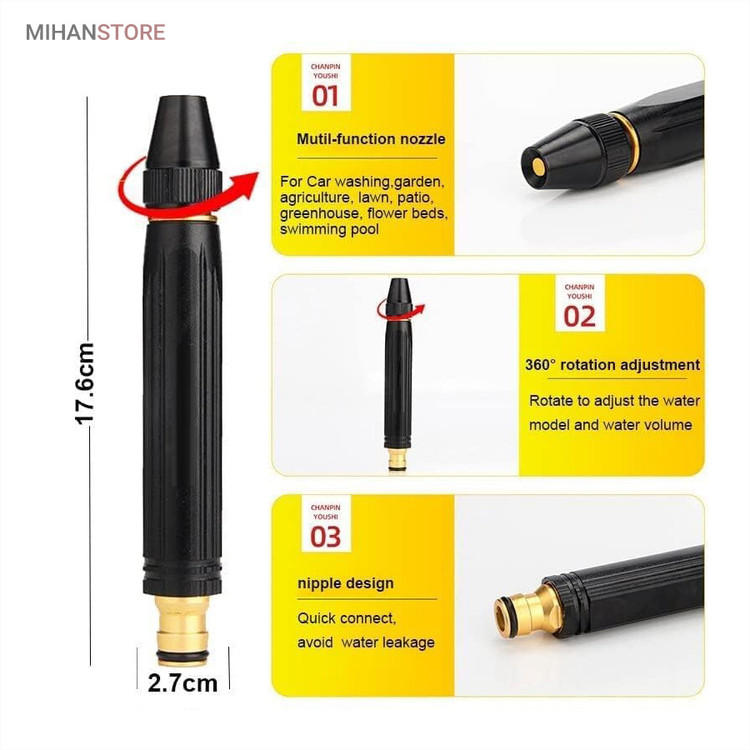 با استفاده از این نازل کارواش دستی به کمک یک بست به شلنگ متصل کرده و از نتیجه آن لذت ببرید. معمولا از این کارواش دستی برای آبیاری باغ، شستن ماشین ها، ایوان، چمن ها، گلها و تمیز کردن حمام، آشپزخانه، بالکن، راهرو، فرش و خیلی موارد دیگر استفاده می شود.