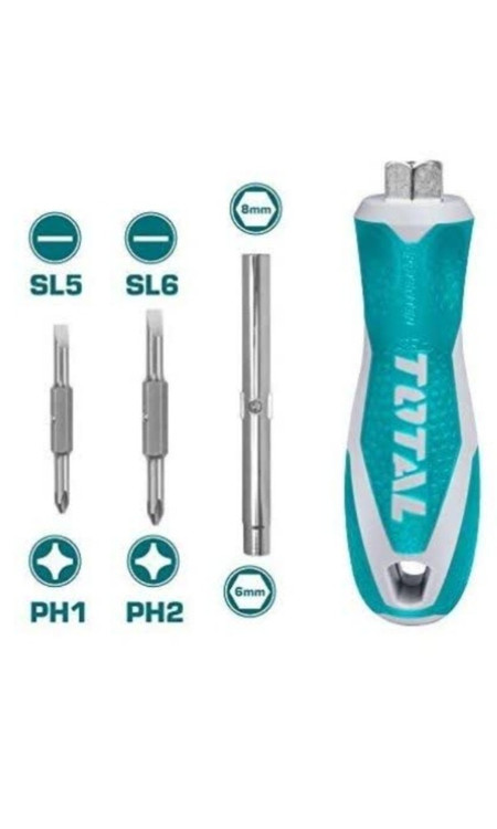 پيچ گوشتی 6 حالته توتال مدل THT250607 محصول شرکت توتال می باشد. این پیچ گوشتی دارای 2 سری دو حالته دوسو و چهارسو می باشد.و میله بلند 11.5 سانتیمتری با دو سر بکس شش گوش و یک دسته پیچ گوشتی است. قابلیت تعویض آسان سری ها و جمع شدن آن در یک پیچ گوشتی باعث میشود که در جعبه ابزار شما فضا کمی را اشغال نمایید و به علاوه بسیار سبک و خوش دست می باشد سری های این پیچ گوشتی در مقابل سایش بسیار مقاوم می باشد دسته آن ضد تغریق و لغزش می باشد و طراحی ارگونومیک آن باعث می شود دست در هنگام کار با آن خسته نشود.